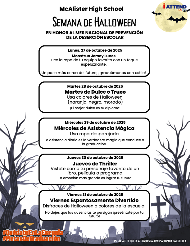 McAlister Halloween Spirit Week See the flyers for details! Attached Files McAlister National Dropout Prevention Month Spirit Week copy.pdf McAlister National Dropout Prevention Month Spirit Week.pdf